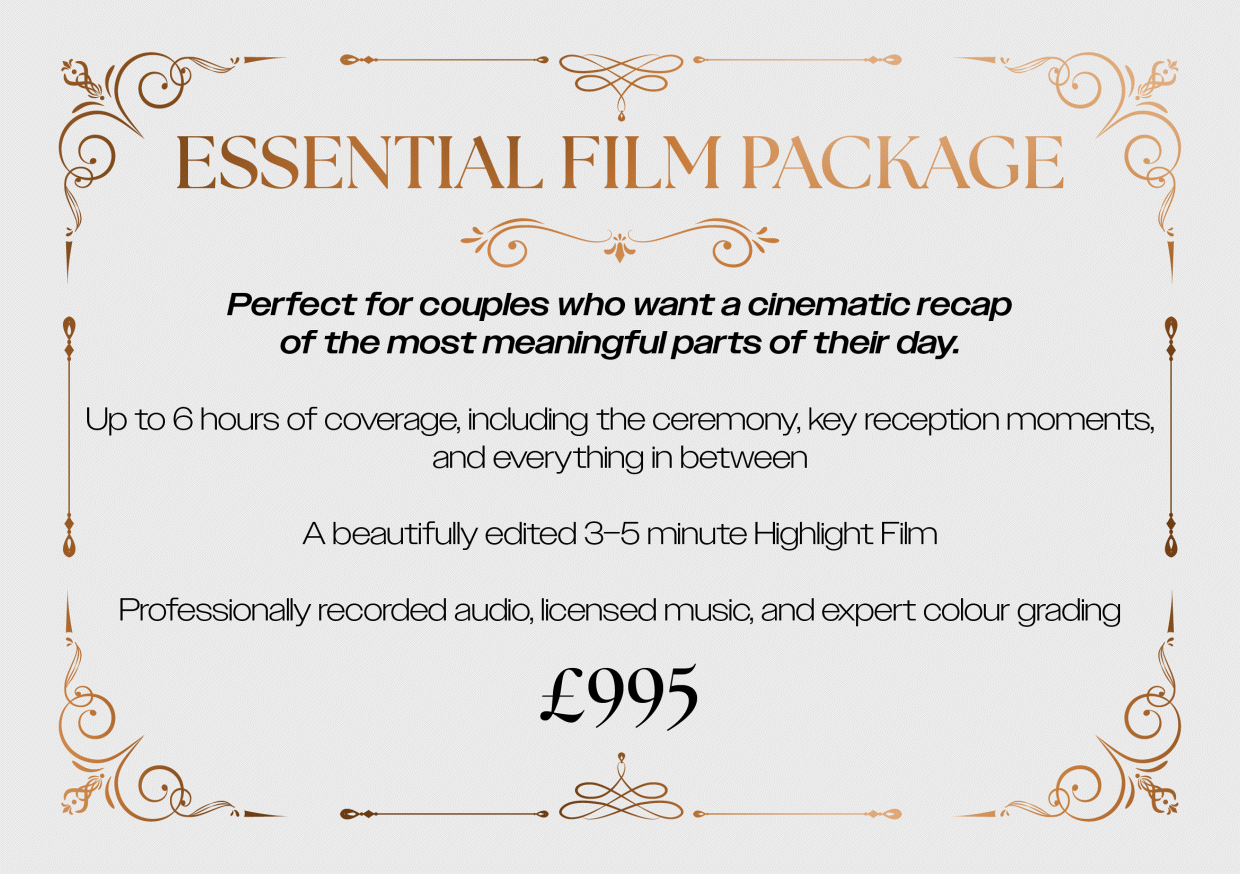 Couples who want a cinematic record of their full wedding day, including prep, ceremony, speeches, and key celebrations. Ideal for those looking to relive the emotion and story of the day in a beautifully edited film.